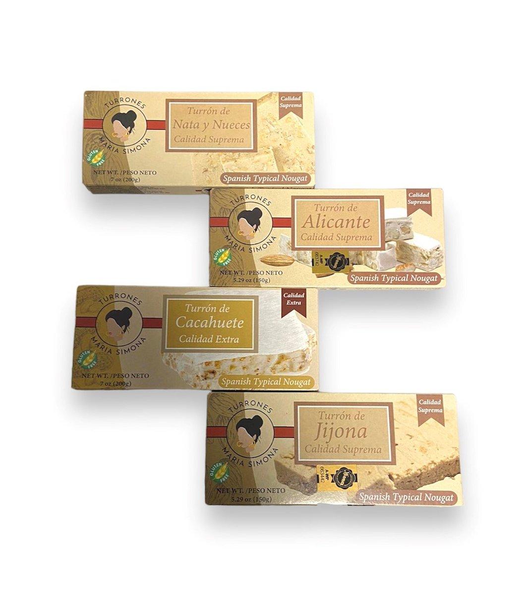 Le Pack Séléction contient un total de 4 tablettes de Turron Alicante, Cacahuete, Jijona et Nata y nueces Maria Simona.